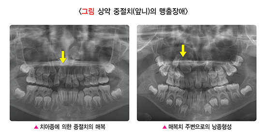 치아가 턱뼈(악골)에서 발생하여 기능하는 위치까지 이동하는 맹출 과정에 문제가 발생하여, 치아가 정상적인 위치에 도달하지 못하는 경우를 맹출 장애라고 합니다. 맹출 장애는 특별한 임상적 증상이 없는 경우가 많으므로 조기 발견을 위해서는 방사선학적 검사를 포함한 정기적인 치과 검진이 중요합니다.