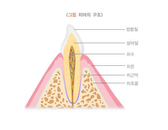 치아 머리 부분의 가장 바깥쪽은 인체에서 가장 단단하고 표면이 매끈한 법랑질(사기질)로 둘러싸여 있어서 외부의 모든 자극으로부터 치아를 보호합니다. 법랑질의 바로 밑에서 치수까지는 상아질이라는 물질로 되어 있는데 이것은 치아의 몸체를 이루고 있는 부분입니다. 상아질 내부는 상아세관이라는 미세한 관이 치수로 연결되어 있는데 이 속에는 신경섬유가 들어있습니다. 따라서 상아질이 외부로 노출되면 외부자극을 직접적으로 받게 되므로 치아가 시리거나 아픈 증상을 느낄 수 있는데 이것을 상아질과민증이라고 합니다. 상아질과민증은 치주염으로 인하여 잇몸의 경계 부위가 아래로 내려가서 치아의 뿌리가 노출되는 경우나 치아의 마모나 손상에 의해서 치아 목 부위(치경부)의 상아질이 노출된 경우 잘 발생합니다.