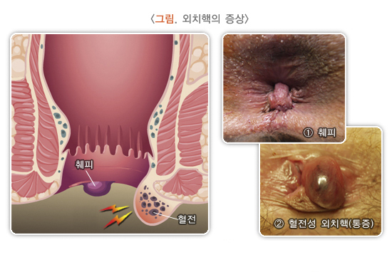 외치핵이 발생하는 치상선 아래쪽은 점막에 비해 단단한 피부로 덮여 있어 쉽게 출혈이 되지 않고 탈항도 되지 않습니다. 대신 외치핵이 커지면서 늘어난 피부가 항문 밖으로 만져지는 '췌피'가 생기거나, 피부 속에서 출혈이 되어 피하조직에 혈전이 발생하면 외치핵이 갑자기 붓고 심한 통증이 발생하게 됩니다.