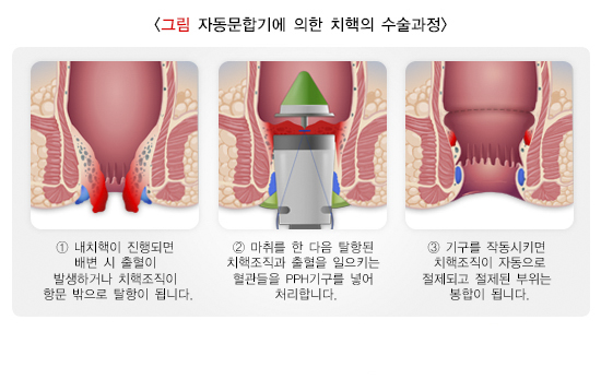 치핵의 크기가 크거나 보조요법으로 증상의 호전을 보이지 않는 경우, 또한 치핵이 탈출되어 있는 경우에는 수술을 통하여 치핵을 제거해야 합니다.