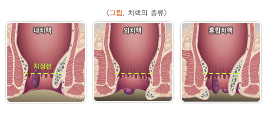 치핵은 발생 부위에 따라 다음 세 가지로 구분됩니다.