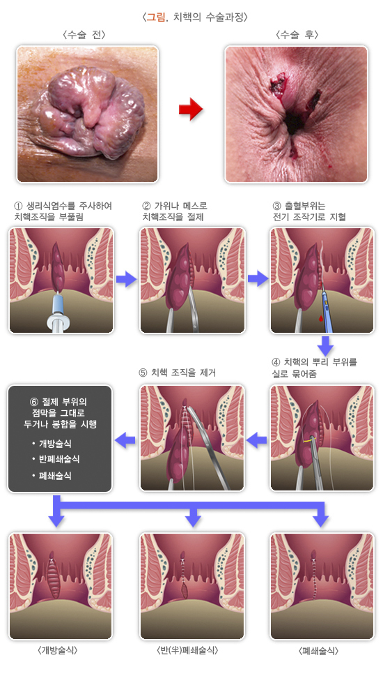 치핵의 치료는 좌욕이나 약물요법 등의 보존적 방법과 치핵을 얼리거나 굳히는 보조요법, 그리고 치핵을 떼어내는 수술적 방법으로 구분됩니다.