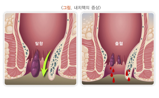 내치핵이 발생하는 치상선 위쪽의 점막조직은 피부조직에 비해 항문 벽에 느슨하게 붙어 있으므로 내치핵이 어느 정도 커지면 변을 볼 때 항문 밖으로 밀려나와 '탈항'이 됩니다. 그리고 점막 조직은 피부에 비해 약하기 때문에 변을 볼 때 상처가 생기면서 출혈이 발생하기도 합니다. 하지만 점막 조직은 상피 조직과 달리 감각신경이 분포하지 않으므로 대부분의 내치핵 환자들은 별다른 통증을 느끼지 못합니다.