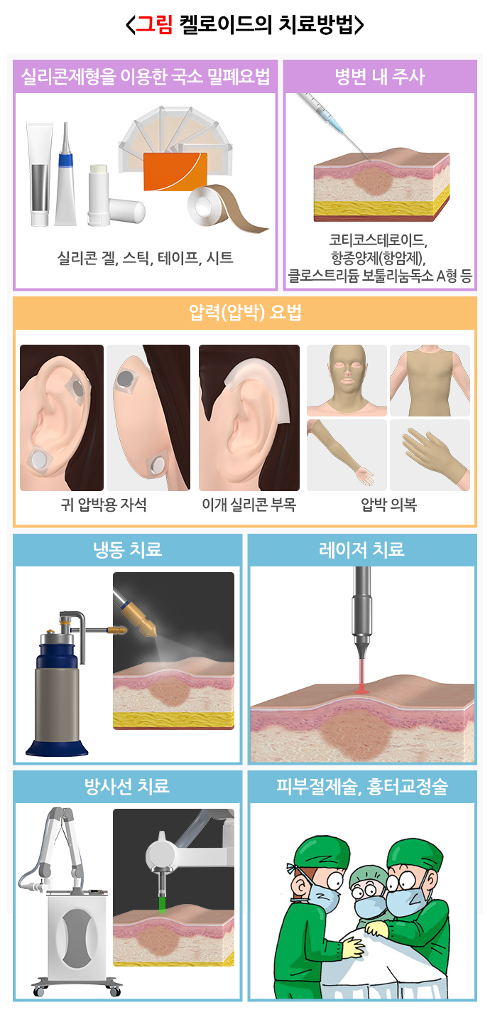 켈로이드의 치료는 크게 보존적 치료와 침습적 치료로 나눕니다. 보존적 치료에는 자외선 차단, 실리콘 제제 도포 및 밀폐, 자석 등을 이용한 압박, 면역반응 조절효과가 있는 이미퀴모드(imiquimod) 연고 도포 등이 있으며, 침습적 치료에는 냉동치료, 레이저치료, 방사선치료 등 최소 침습적 시술과 병변 내 직접 약물 주입(병변 내 주사), 외과적 흉터교정술 같은 침습적 시술이 있습니다.