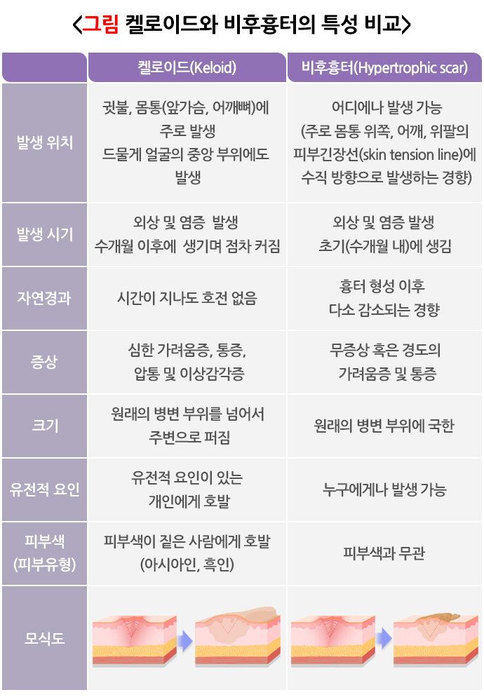 켈로이드는 비후흉터와 감별하는 것이 중요한데, 비후흉터는 켈로이드에 비해 흉터의 크기와 높이가 작고 너비가 좁으며, 일정 수준으로 커진 후에는 작아지기도 합니다.