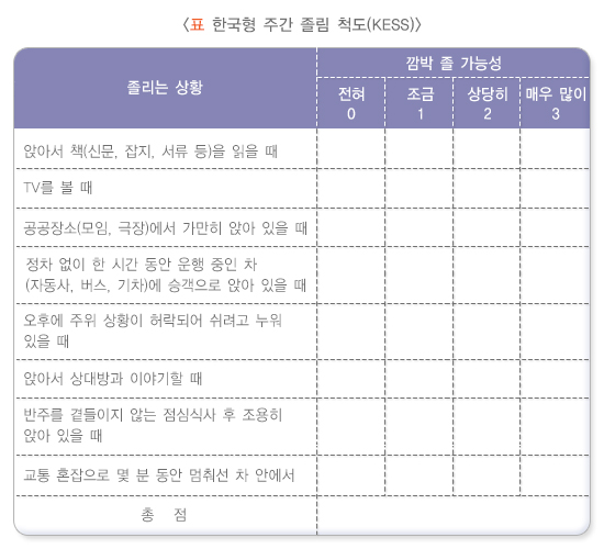 심한 폐쇄수면무호흡증후군 환자는 기계 조작 시 사고의 위험이 높고, 운전자는 졸음운전으로 인한 교통사고의 발생 가능성이 매우 높습니다. 또한 발기부전이 생길 가능성이 높습니다. 특히 주간에 과다하게 졸린 현상은 폐쇄수면무호흡증후군 환자의 87%에서 호소하는 증상이며, 스스로 심한 정도를 간단하게 평가할 수 있습니다(표 1 참고). 8점 이상이면 반드시 의사의 진찰이 필요합니다.