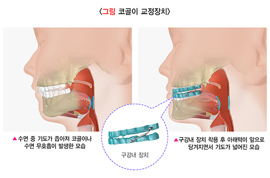 • 구강내 장치: 수면 중 기도를 넓혀주기 위해 착용합니다. 구강내 장치는 젊은 환자, 낮은 체질량지수, 목둘레가 굵지 않은 환자, 수면 자세에 따라 수면무호흡이 사라지는 경우, 증상이 심하지 않은 환자들에게 권합니다.