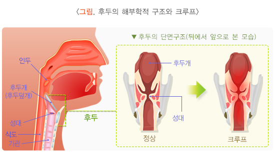 후두염은 주로 바이러스 감염에 의해 후두에 염증이 생기는 질환입니다. 후두는 공기가 통하는 기도의 시작 부위에 위치하는 기관으로 성대를 포함하고 있어 숨쉬고 말하는 데 중요한 역할을 합니다. 후두의 염증은 후두에 국한되는 것이 아니라 아래로 확산되어 기관 또는 기관지의 병변을 동반하는 경우가 많습니다. 병변의 범위에 따라 후두염, 후두기관염, 후두기관기관지염, 후두기관지폐렴으로 분류하고, 이 질환들을 모두 포함하여 크루프라고 정의하는 경우가 많습니다.