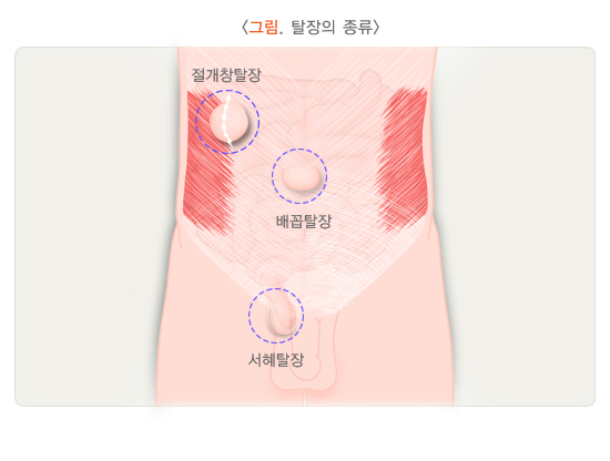 · 배꼽탈장 : 배꼽 부위에 발생한 탈장으로 신생아에서 주로 발생합니다.