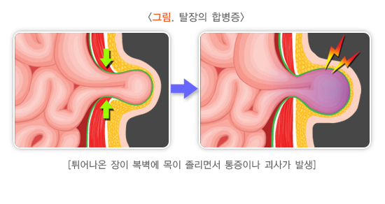 교액 탈장의 경우 탈장된 장기가 괴사되면서 심한 통증이 발생할 수 있습니다.