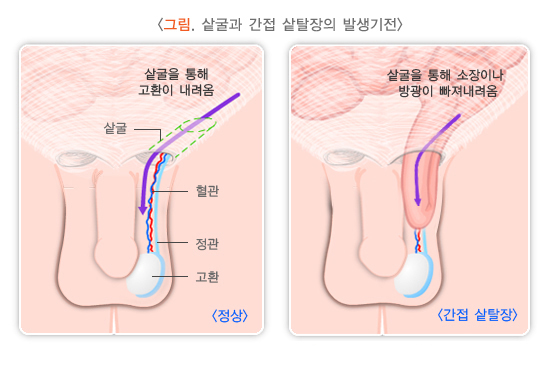 남자아기의 고환은 출생 전까지 복부 속에 들어 있다가 출생을 전후로 하여 아래로 빠져 내려와 음낭 속에 위치하게 됩니다. 이때 고환이 내려오는 복벽 속의 통로를 ‘샅굴’(inguinal canal)이라고 부르며 이곳을 통해 고환으로 들어가는 혈관과 정관이 지나갑니다. 한편, 여자아기의 샅굴 속에는 남자아기와 달리 인대조직만 들어 있습니다.정상적인 경우에는 출생 이후 샅굴 입구가 저절로 막히는데 비해 이것이 막히지 않고 열려있을 경우에는 소장, 난소 또는 방광 등이 샅굴 속으로 빠져 내려올 수 있으며 이것을 ‘간접 샅탈장’ 이라고 합니다.