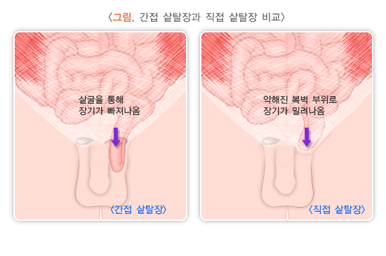 · 샅(서혜)탈장 : 사타구니 부위에 발생한 탈장, 간접형과 직접형이 있습니다.