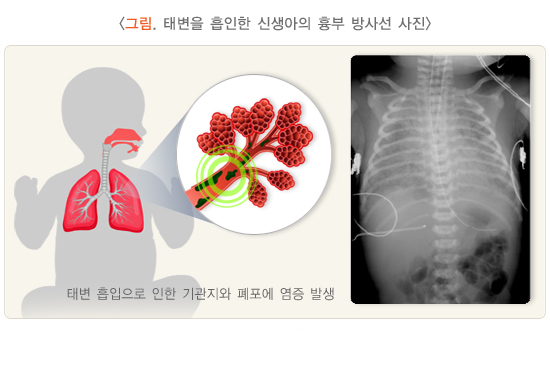 정상적으로 태변은 출생 후에 배출됩니다. 하지만, 급성 또는 만성 저산소증이나 감염 등으로 태아가 자궁 내에서 많이 힘든 경우(가사, distress)에는 부교감 신경이 활성화되어 태아의 장 운동이 빨라지고 항문 근육의 힘이 약해지면서 태변이 양수로 배출될 수 있습니다. 이때는 호흡도 힘들어져 헐떡이게 되는데(gasping), 이때 태변이 포함된 양수가 기도로 들어갑니다. 태변은 기도를 직접적으로 막을 뿐만 아니라, 폐 표면 활성제의 생성이나 기능을 화학적으로 억제하므로 호흡 곤란의 원인이 됩니다.