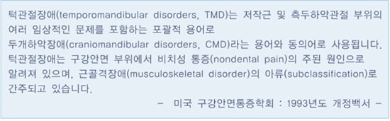 턱관절장애는 흔히 “악관절장애”라고도 하며, 두통을 포함한 두경부 통증장애를 포함하는 경우가 대부분이어서 “측두하악장애” 또는 “두개하악장애”라고도 부릅니다. 턱관절장애에 대한 미국 구강안면통증학회의 정의는 다음과 같습니다.