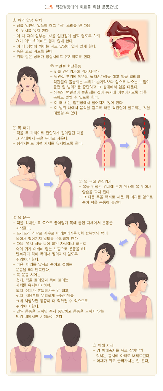 운동요법은 혀의 안정 위치, 턱관절 회전운동, 목 펴기, 목 관절 안정위치, 목운동, 어깨 자세 등의 6가지 내용을 다음과 같이 시행합니다.