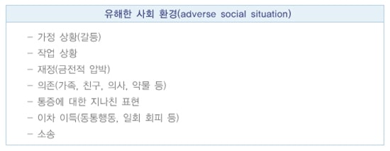 환경적 기여요인은 사람이 직접 조절할 수 없으나 통증문제에 기여하는, 개인의 물리적 환경(person`s physical environment)에서의 자극을 말합니다. 이는 통증과 질환에 대한 개인의 인지와 반응에 영향을 주어 치료를 매우 복잡하게 할 수 있습니다.