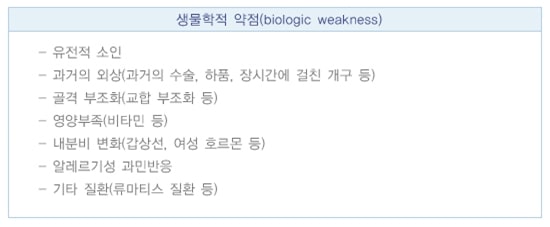 ㆍ 최근 또는 과거로부터 존재하는 관련 신체 이상이나 질병(특히 전신적 관절염이나 다른 골격성/류마티스성 상태)