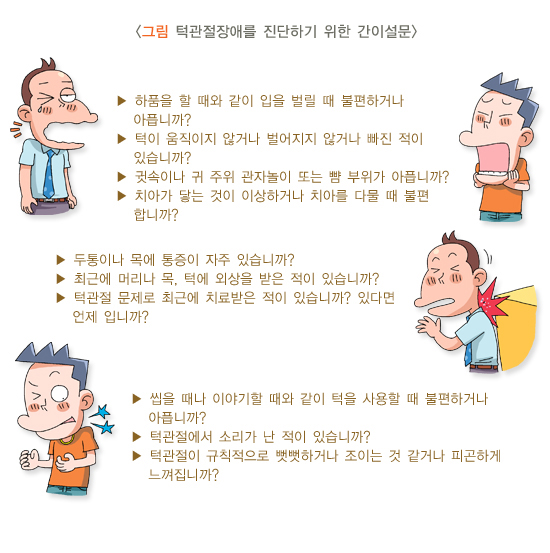 턱관절장애를 진단하기 위해서 사용하는 간이설문지의 내용은 아래와 같습니다.