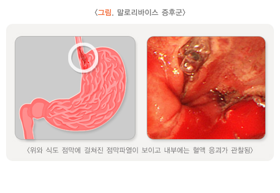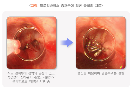심한 구역이나 구토에 의해 위 내용물이 식도로 넘어오면서 위식도 접합부 점막에 상처를 일으켜 토혈하는 증상을 말로리바이스 증후군이라 합니다. 대부분 특별한 치료를 시행하지 않고 대증요법으로 치유됩니다. 하지만 출혈이 멎지 않거나 재출혈 위험이 높다면 내시경으로 치료해야 합니다. 내시경 치료가 어렵거나 혈압이 떨어져 내시경 검사 자체가 어렵다면 혈관조영술을 시행해 출혈 부위의 혈관을 막거나 출혈하는 동맥내에 직접 혈관 수축제를 투여합니다.