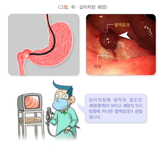 소화성 궤양에 의한 출혈은 임상에서 흔히 볼 수 있습니다. 위상부의 소만부와 십이지장 구부의 후하방은 혈관이 풍부해 이 부위의 궤양이 생기면 쉽게 혈관이 손상되어 출혈이 발생합니다. 궤양은 위산 분비가 많은 경우, 헬리코박터 파일로리 감염, 진통제 등 비스테로이드 소염제를 복용하는 경우에 발생하며, 심장질환, 뇌혈관질환, 만성 폐질환, 간경변증 등 만성적인 질환에서도 잘 동반됩니다.