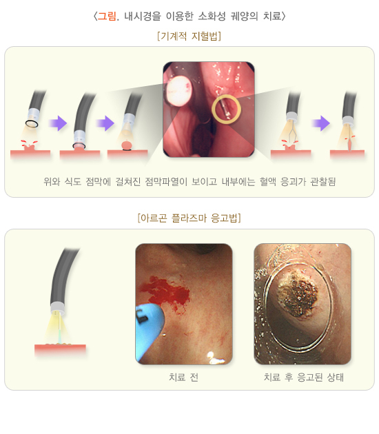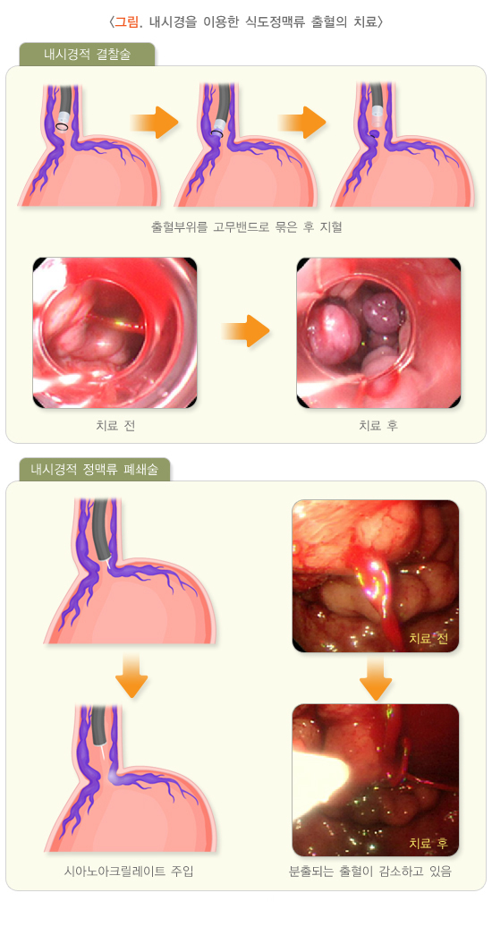 내시경 치료는 내시경적 결찰술, 시아노아크릴레이트를 정맥류 내로 주입하는 내시경적 정맥류 폐쇄술, 내시경적 경화요법이 있습니다.