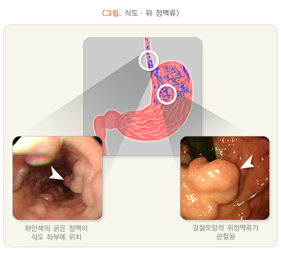 정맥류는 주로 위나 식도에서 정맥이 혹이나 구렁이처럼 푸르스름하게 부풀어 오르는 병으로 평소에는 증상이 없습니다. 하지만 정맥류가 파열되면 심한 출혈이 일어나 다량의 피를 토할 수 있습니다. 위정맥류는 식도정맥류에 비해 더 깊숙한 점막하층에 있고 크기가 크며 큰 정맥에서 혈액이 유입되므로 출혈량이 많아 사망률이 높고 재출혈 가능성도 더 높습니다.