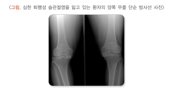 심한 퇴행성 변화가 발생한 무릎 관절은 단순 방사선 검사를 통해서도 진단이 가능하므로 자기 공명 영상 검사는 꼭 필요한 경우에만 시행하는 것이 좋습니다.