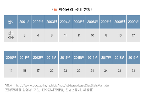 국내에서는 1976년에 제2군 전염병으로 지정되어 신고를 받기 시작하였습니다. 1980년대 DTaP(디프테리아/파상풍/백일해) 백신의 접종률이 90%를 웃돌면서 신생아 파상풍은 거의 발생하고 있지 않으며, 1990년대 이후 전 연령의 파상풍이 연간 10건 내외로 간헐적으로 보고될 뿐입니다. 그러나 2017~2019년에 30여 건 등 최근에 발생이 다소 증가하고 있어 소아기 이후에도 추가 접종으로 파상풍에 대한 지속적인 면역 유지 필요성이 제기되고 있습니다. 2020년 1월 법정감염병분류체계 개편으로 3급 감염병으로 변경되었습니다.