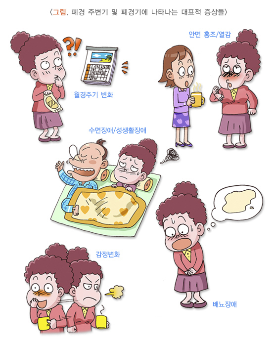 사람에 따라 우울, 흥분, 감정의 심한 기복이나 자신감의 상실, 집중력 저하, 고독, 불안, 신경과민 및 권태감, 두통, 불면증, 공격성 등을 보입니다. 감정 변화는 폐경 시 겪는 신체 변화에 따른 실망감이나 상실감에서도 기인하지만, 가정과 사회 등 환경의 영향을 받기도 합니다.