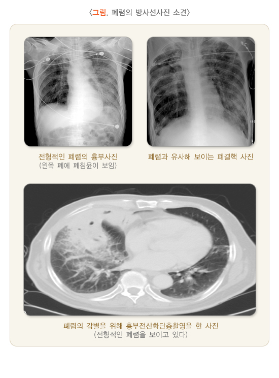 때로는 임상 증상과 진찰만으로도 진단할 수 있지만, 대부분 가슴 X선 촬영이 필요합니다. 폐렴에 합당한 증상과 진찰 소견이 있고, 가슴 X선에서 경화 소견이 관찰되면 어렵지 않게 진단할 수 있습니다. 하지만 X선 사진이 명확하지 않거나, 다른 합병증이 의심될 경우 CT 촬영이 필요할 수도 있습니다.