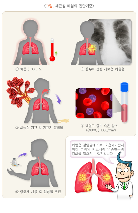 소아폐렴은 전형적 임상 증상과 흉부방사선 소견을 근거로 진단합니다. 폐부위에 침윤이 관찰되면 폐렴으로 진단하는데, 침윤의 양상을 기반으로 대엽폐렴, 기관지폐렴, 간질폐렴으로 구분합니다. 호중구감소증 환자나 탈수가 심한 사람은 폐렴에 걸렸어도 간혹 폐침윤이 보이지 않는 경우도 있습니다. 이 경우, 임상증상이 전형적이라면 일정 시간 간격으로 흉부방사선을 다시 촬영하면 추후에 침윤이 관찰되기도 합니다. 임상적으로 "세균 폐렴의 진단기준"을 만족하면 세균 폐렴의 치료를 위해 경험적 항생제를 미리 시작하기도 합니다. 기준은 38.3도 이상의 고열, 흉부방사선에서 폐침윤 발견, 화농성 기관 및 기관지분비물, 백혈구의 증가 혹은 감소, 항균제 사용 후 임상적 호전 등입니다.