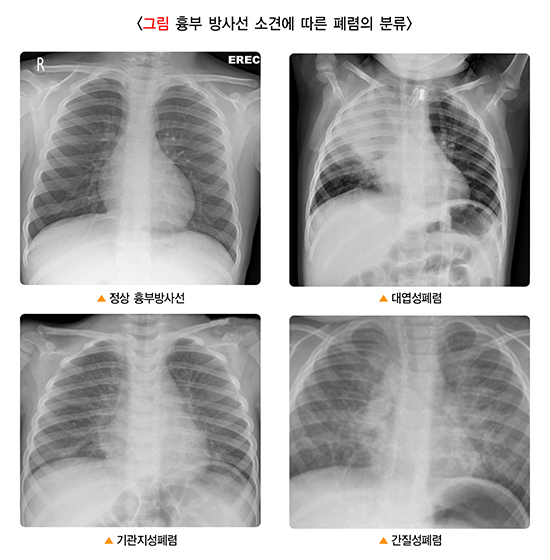 소아폐렴은 침범한 해부학적 부위에 따라 대엽(혹은 소엽)폐렴과 기관지폐렴, 간질폐렴으로 분류할 수 있으나 구분이 아주 명확하지는 않습니다. 폐의 특정 엽 전체(대엽폐렴) 혹은 일부(소엽폐렴)를 침범하면 대엽(혹은 소엽)폐렴이라 부릅니다. 반면 하기도의 폐포 주변 결체조직을 주로 침범하는 폐렴은 간질폐렴이라 부릅니다. 간질폐렴은 흉부영상에서 모래를 흩뿌린 것 같은 망상형 침범이 특징적입니다. 기관지폐렴은 소엽폐렴과 간질폐렴이 기관지를 따라 여기저기 흩어져 있습니다. 흉부영상에서 군데군데 반점 모양의 침범이 기관지 주행을 따라 관찰됩니다.