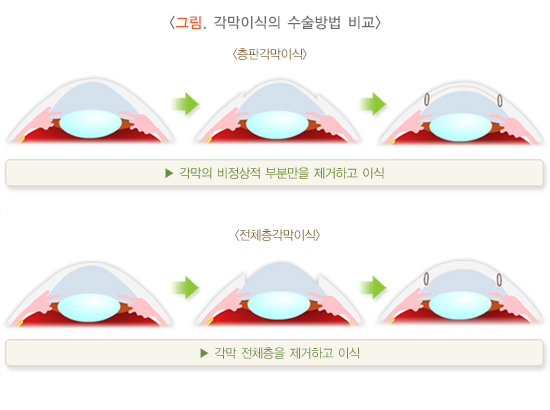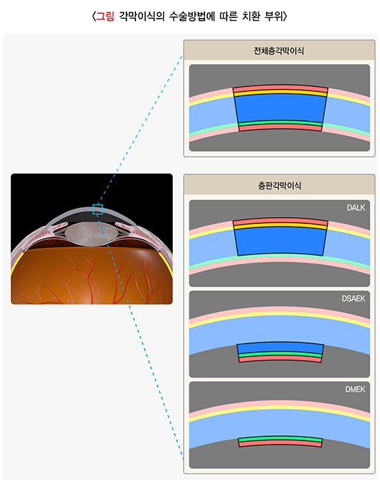 이식하는 층에 따라 각막의 앞쪽을 치환하는 심부앞층판각막이식(deep anterior lamellar keratoplasty, DALK), 각막의 뒤쪽을 치환하는 데스메막박리자동내피각막이식(Descemet-stripping automated endothelial keratoplasty, DSAEK)과 데스메막내피각막이식(Descemet membrane endothelial keratoplasty, DMEK)이 주로 시행되고 있는 수술 방법입니다.