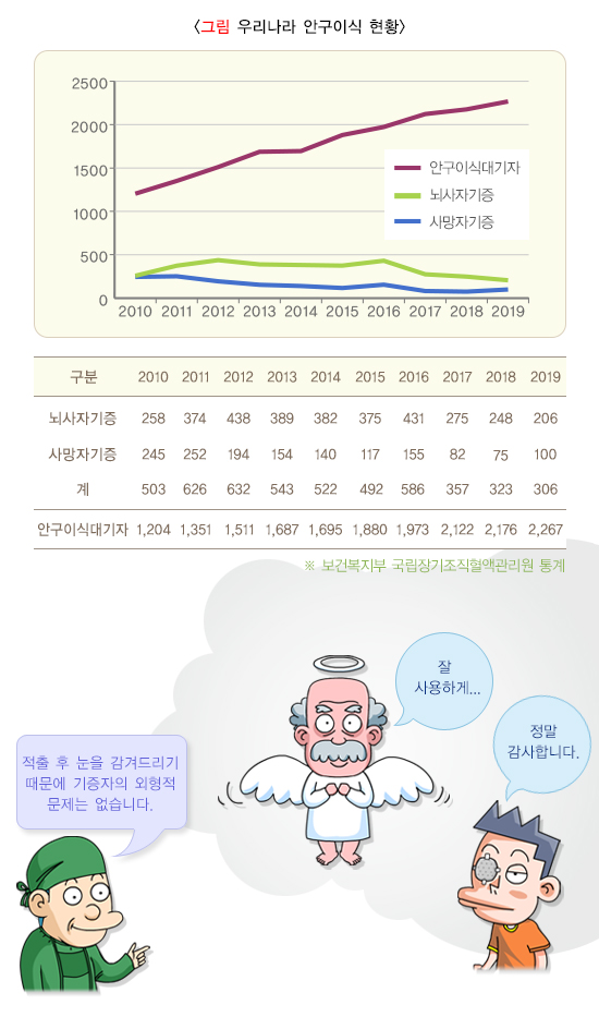 건강보험심사평가원에서 집계한 통계에 의하면 2019년 한 해 동안 국내에서는 1100건(각막 896건, 공막 184건 포함)에 가까운 안구이식이 시행되었고, 보건복지부 국립장기조직혈액관리원에서 발표한 자료에 따르면 국내 기증자에 의해 시행된 안구이식 건수는 매년 꾸준히 감소하고 있어 2019년에는 306건(뇌사 206건, 사후 100건)에 불과해 안구 기증자의 수가 턱없이 부족한 실정입니다. 실제 우리나라의 안구이식대기자는 매년 꾸준히 증가하고 있어 2019년 현재 약 2300명이 안구이식대기자로 등록되어 있고 평균대기일은 2939일로 약 8년을 기다려야 국내 기증자가 공여한 각막으로 수술을 받을 수 있습니다(2019년도 장기등 이식 및 인제조직 기증 통계연보, 보건복지부 국립장기조직혈액관리원). 따라서 많은 경우에 안구의 공급을 외국 안은행을 통한 수입에 의존하고 있습니다.