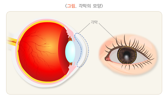 각막이란 눈의 가장 앞쪽에 위치한 투명한 조직으로, 안구 속이 어두워 겉보기에는 흔히 "검은 동자"로 불리지만 실제로는 인체에서 가장 투명한 조직입니다. 이런 투명성을 유지하기 위해 각막은 다른 장기와 다른 몇 가지 특성을 갖고 있습니다.
