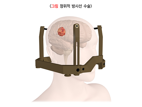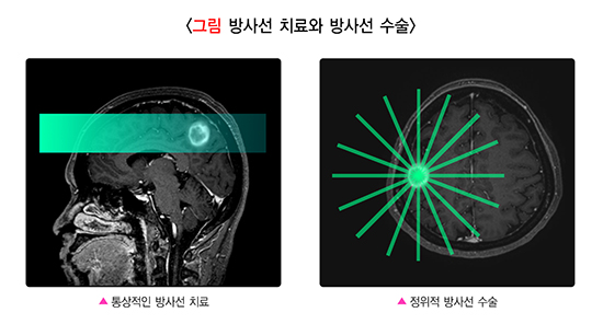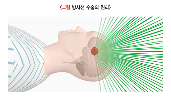 성장을 매우 빠르게 하는 악성 종양의 경우에는 종양 세포를 방사선을 이용하여 치료하는데, 낮은 방사선량을 여러 번 나누어(multiple fraction) 주는 것이 더 효과적이지만, 정상 뇌조직으로 구성되어있고 기능에 이상이 발생한 뇌의 특정 부위를 방사선을 이용하여 파괴하기 위해서는 한 번에 매우 높은 방사선량을 이용하는 것이 더 효과적이었기 때문입니다. 따라서 방사선을 이용해서 정상 뇌 조직의 일부를 파괴하는 것을 기본적인 목표로 한 것이 ‘방사선 수술’이었기에, ‘통상적인 방사선 치료’와는 완전히 다른 방식을 적용할 수밖에 없었던 것입니다.
