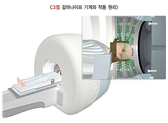 스웨덴의 신경외과 의사인 라스 렉셀(Lars Leksell)은 1951년에 한 편의 논문을 발표합니다. 이 논문에서 그는 머리에 반원 형태의 틀을 고정하고, 그 틀에 X-선(X-ray) 발생 장치를 연결하는 방식으로 뇌 질환이나 종양을 치료하는 방법의 가능성을 소개하는 것이었습니다. 그 틀을 앞뒤로 회전시키고, 엑스선 발생 장치를 틀을 따라 좌우로 이동시키면, 머리의 어느 방향에서나 원하는 뇌의 목표 부위에 방사선을 전달할 수 있었습니다(그림).