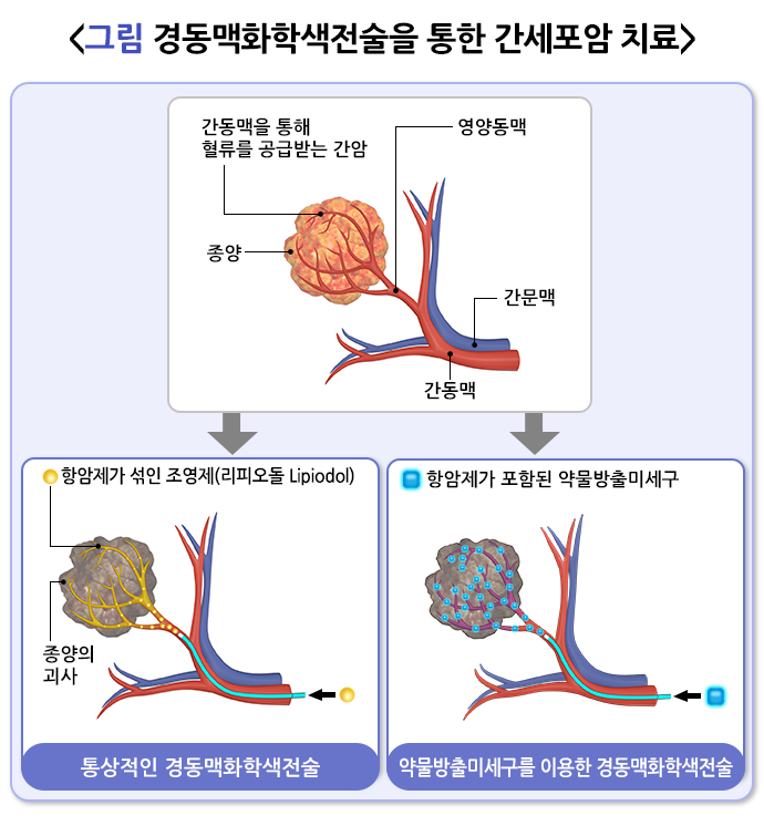 약물방출미세구를 이용한 경동맥화학색전술은 통상적 경동맥화학색전술과 거의 동일하지만, 혈류차단물질이 다릅니다. 약물방출미세구는 폴리비닐알코올이나 하이드로겔 기반 합성 고분자로 만들어진 미세한 구형입자로 항암제를 탑재할 수 있습니다. 리피오돌 유탁액보다 항암제가 서서히 방출되어, 전신 혈류로 빠져나가는 항암제가 크게 감소하므로 종양 내 항암제 농도가 높게 유지됩니다. 통상적 경동맥화학색전술과 치료 효과는 거의 비슷하지만, 색전후증후군이 더 적어 입원 기간이 짧다는 장점도 있습니다.