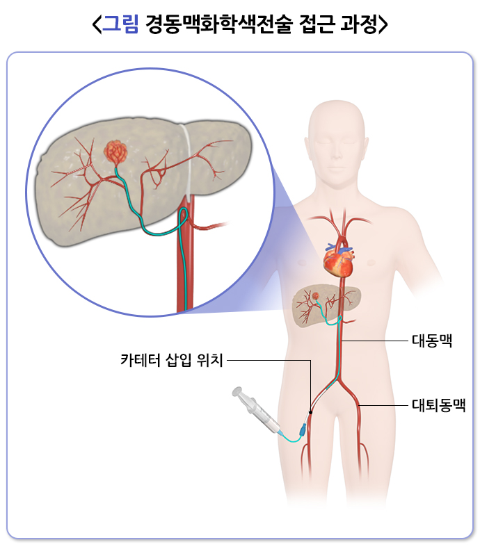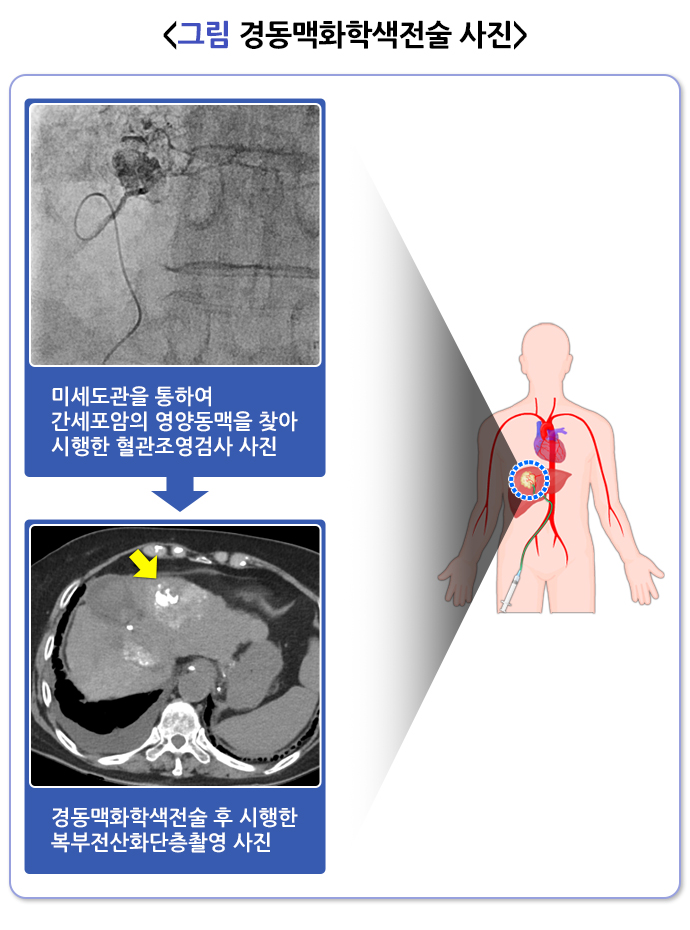 경동맥화학색전술은 간이식, 간절제, 국소치료 등 근치적 치료를 적용하기 어려운 간세포암종 환자에서 흔히 시행합니다. 서양과 달리 국내에서는 국소적으로 간문맥을 침범한 종양에 항암치료를 대신해 시행하며, 종양의 파열로 인해 출혈이 있는 경우에도 시행합니다.