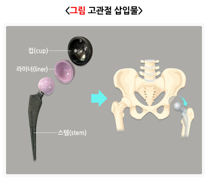 대퇴골 부분에는 대퇴 스템이 들어가고, 비구 부분에는 비구 컵이 들어갑니다. 이 사이에 베어링이 위치하는데, 베어링은 대퇴 스템 쪽에는 인공 골두, 비구 컵 쪽에는 비구 라이너가 있습니다. 인공 골두와 비구 라이너가 접촉해 관절면을 이룹니다. 대퇴 스템 및 비구 컵은 주로 인체에 가장 친화적인 금속인 티타늄 합금 또는 코발트 크롬 합금을 사용합니다.