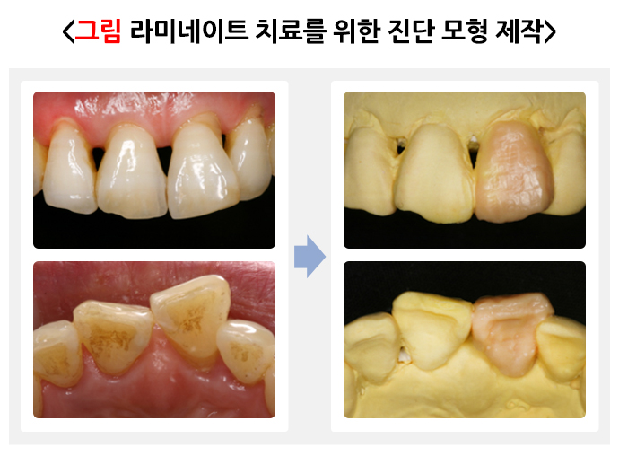 라미네이트 시술 전, 진단 모형을 제작해 환자의 현재 상태와 요구를 파악하고 최종 보철물의 이미지를 형상화합니다. 특히 치료 부위가 클 경우, 이 과정은 필수적입니다. 이를 통해 라미네이트로 치료가 가능한지, 또는 도재관 치료가 필요한지를 판단할 수 있습니다. 또한, 치아 삭제량을 미리 예측해 불필요한 치아 삭제를 줄일 수 있습니다. 환자 역시 치료 결과를 미리 예상할 수 있어 치료 결정에 도움을 받을 수 있습니다.