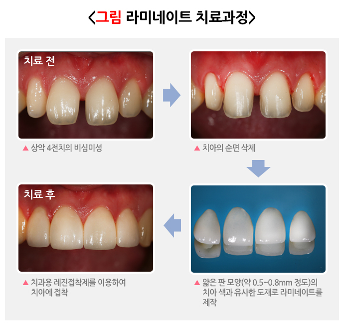 라미네이트 치료란 미관상의 목적으로 주로 위턱 앞니의 법랑질 표면만 최소한으로 깎아낸 후 인조 손톱을 붙이듯이 치아 색과 유사한 얇은 판 모양(약 0.5~1.0mm 정도)의 도재(포세린)나 복합 레진 수복물을 레진 접착제로 접착하는 치과 보철 과정입니다.