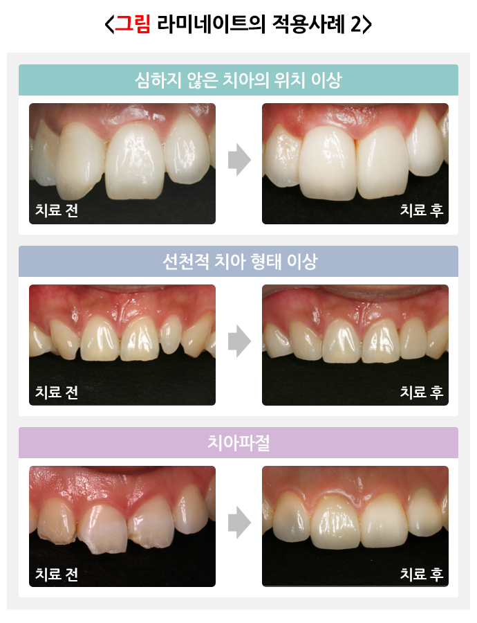 치아가 정상 배열에서 벗어나 회전된 경우나 돌출된 경우 라미네이트 치료를 고려할 수 있습니다. 그러나, 과도하게 위치가 어긋난 경우에는 라미네이트 시술보다 금속-도재관이나 완전 도재관 치료, 또는 치아 교정을 추천합니다.