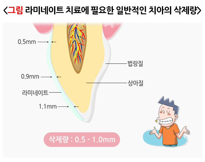 일반적으로 부분 마취 없이도 치아 삭제가 가능하지만, 지각이 과민한 경우 부분 마취를 시행한 뒤 필요한 만큼 치아를 깎아냅니다.