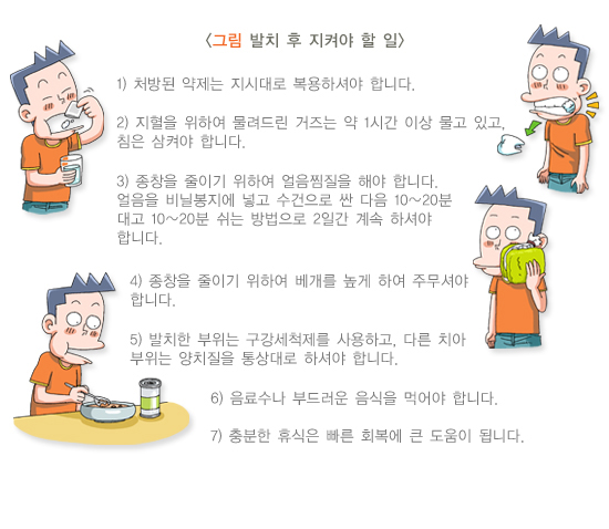 단순 발치 종료 후 초기 염증성 반응은 약 2일 후면 대부분 소실됩니다. 그 뒤로도 종창(부기)과 동통이 지속되면 감염 가능성이 크므로 치과 진료와 더불어 항생소염요법을 계속 시행합니다.