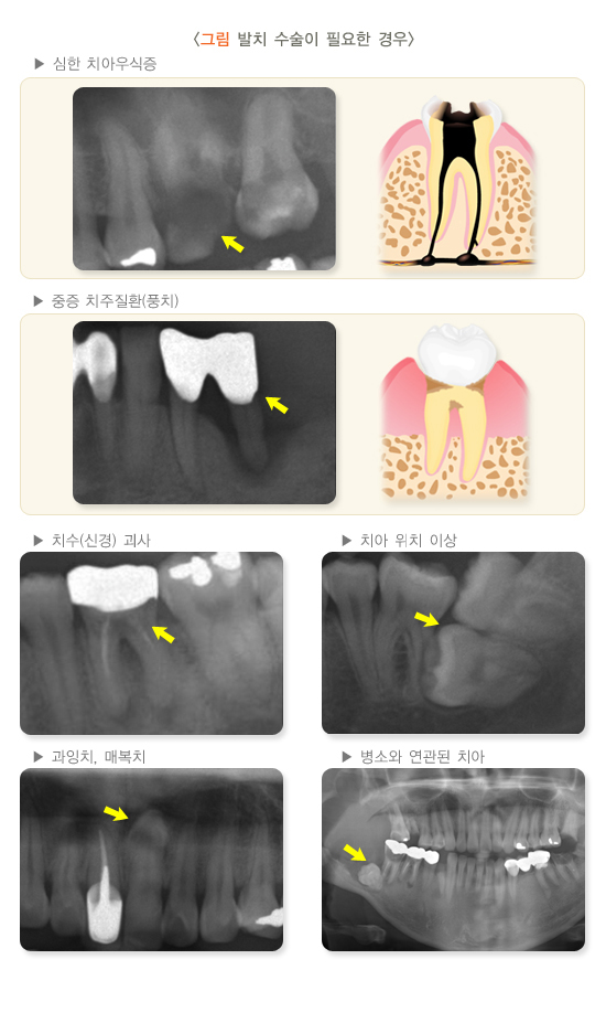 턱뼈 낭종(물주머니), 골수염, 턱뼈 종양 및 치조골(잇몸뼈) 괴사 등 치아 주위 뼈가 병적인 상태인 경우, 해당 치아와 인접 치아를 발치해야 할 수 있습니다.