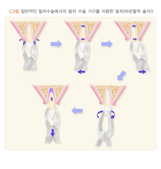모든 발치에 있어서 가장 일반적으로 시행되는 수술입니다. 잇몸을 절개할 필요가 없고 치아 주위의 잇몸뼈도 삭제하지 않습니다. 발치용 기구를 이용해 치아를 잇몸뼈에서 분리하여 제거합니다.