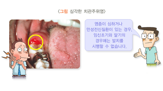 치관주위염은 맹출 중인 치아 주위로 잇몸에 틈이 생겨 음식물이 끼고 곪은 상태를 말합니다. 잇몸이 붓고, 쑤시고, 아픕니다. 증상이 심하지 않으면 바로 발치할 수 있으나, 얼굴이 많이 붓거나 심한 통증을 동반한 경우 먼저 감염을 다스려야 합니다.