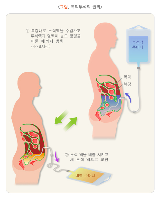 복강과 연결된 실리콘 도관(튜브)을 통해 투석액을 복강 내로 넣으면 몸 속의 노폐물과 수분이 확산과 삼투 현상을 통해 투석액으로 빠져나옵니다. 투석액이 복강 내에 머무는 4~6시간 동안 투석액 내 노폐물의 농도가 점점 더 상승하여 혈액 내 노폐물 농도와 같아지는데 이러한 상태를 포화라고 합니다. 포화 상태가 되면 노폐물이 더 이상 투석액 쪽으로 이동하지 않으므로 복강 내 투석액을 배출하고 새로운 투석액을 복강 내로 주입합니다. 복막투석은 이렇게 주기적으로 투석액을 교환하는 과정입니다.