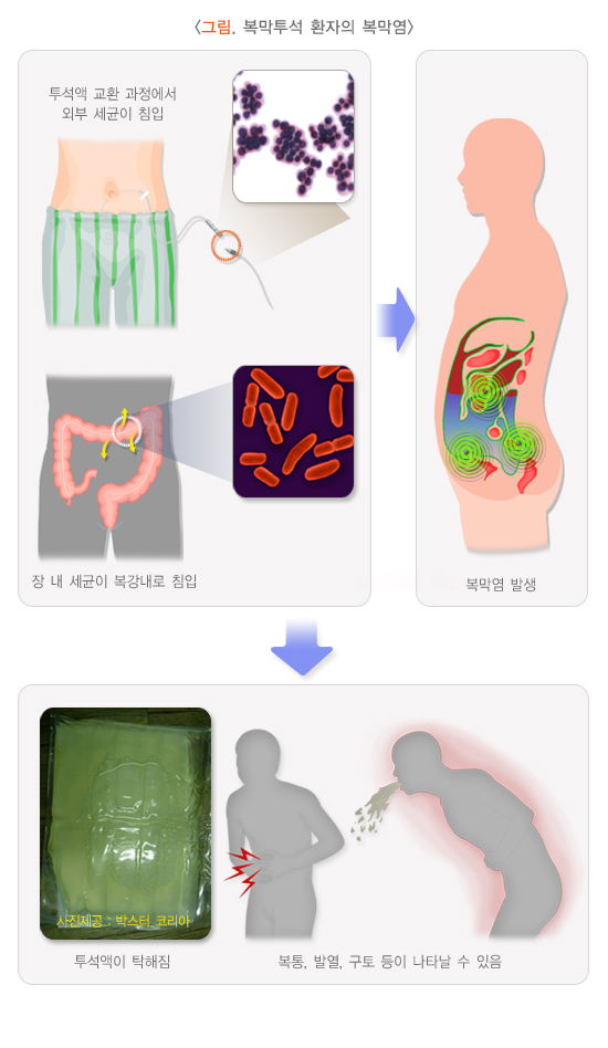 복막액 교환 시 외부의 세균이 도관을 통해 침입하거나 장내 세균이 복강 내로 침입하면 복막염이 발생할 수 있습니다. 드물게는 곰팡이나 결핵균이 복막염의 원인이 되기도 합니다.